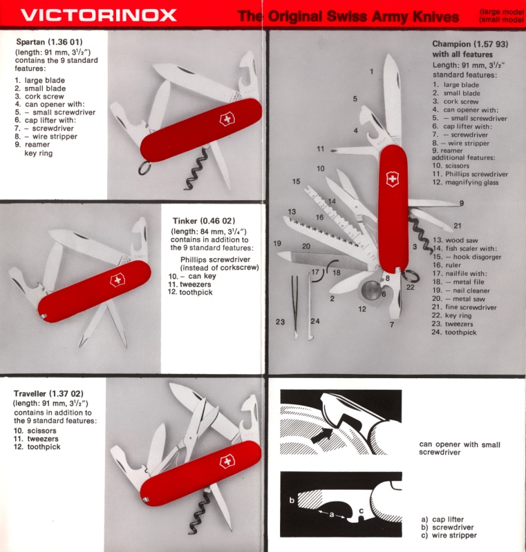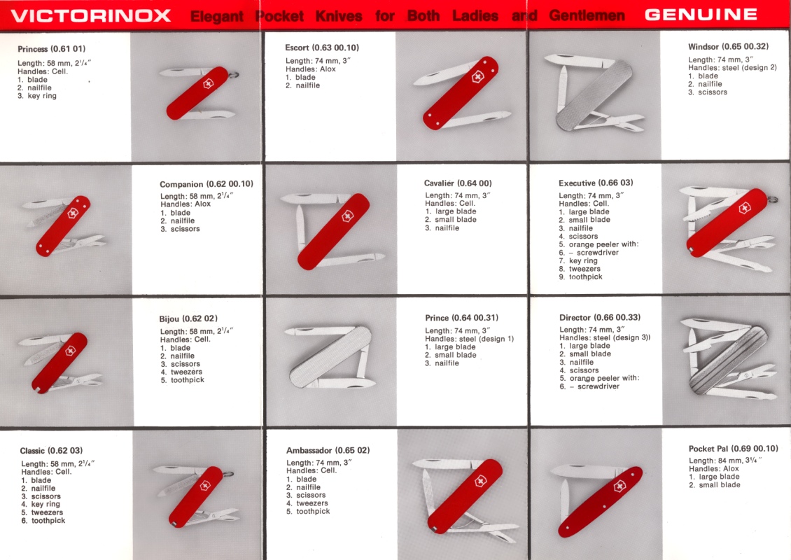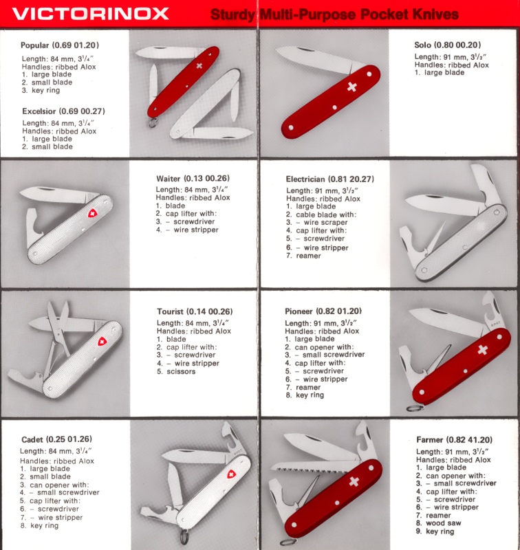 Scanned images from a Victorinox product brochure/catalog estimated to be from the 1970s. Source material provided by Dan Jacquart, scan by ICanFixThat(SOSAK). Alternate catalog source material and scan by ICanFixThat.