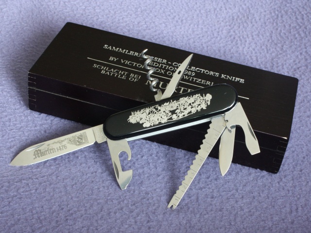 This model came in a black wooden presentation box, which contained a serialised certificate of authenticity, with the serial number matching the liner inscription. There was also a booklet containing a brief description of Battle of Murten and also a history of Victorinox in German, English, and French, however this was only present in the Battle Series Collection presentation case.