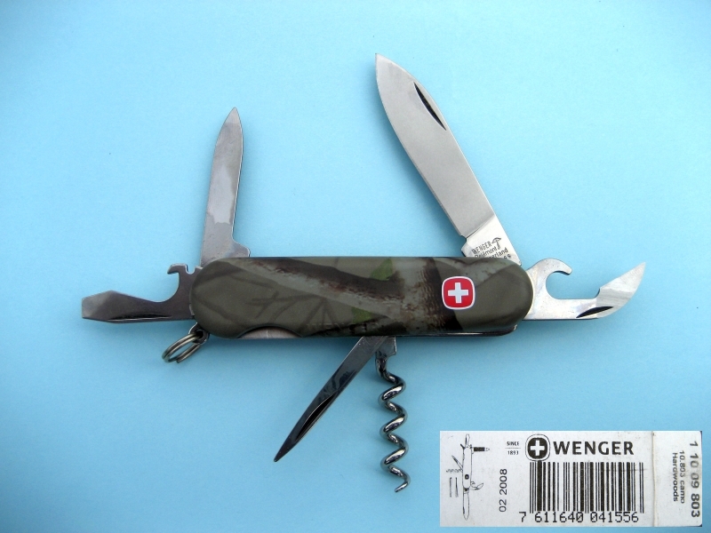 - The Camo 07 was the precursor of the Hardwoods 10 model, and features standard polished tools and differently patterned camouflage scales. 'WENGER' is not embossed on the front scale, and no toothpick or tweezers.