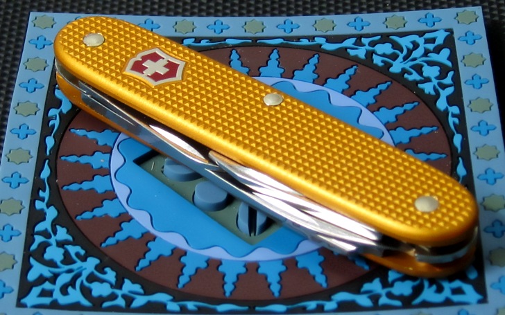 - A yellow-gold Electrician was produced in a special run for collectors in April 2012. Limited to fifty models, each knife is engraved with n/50 on the obverse of the small electrician's blade (there is no production vintage). This knife also included a couple of additional special attributes such as a red shield background on the top scale, and a lightning bolt logo in black printed in the engraving panel on the bottom scale. This anodizing color is not known to have been used on a 93mm model before, and almost certainly never with a red shield. The anodizing was originally described as a orange, but appears to be more gold.