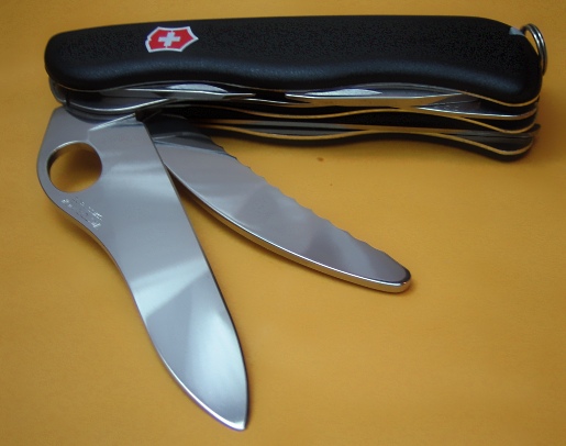 - Trekker - Serrated main blade; removes the belt cutter blade and corkscrew; adds a Phillips driver