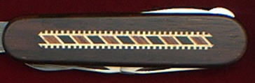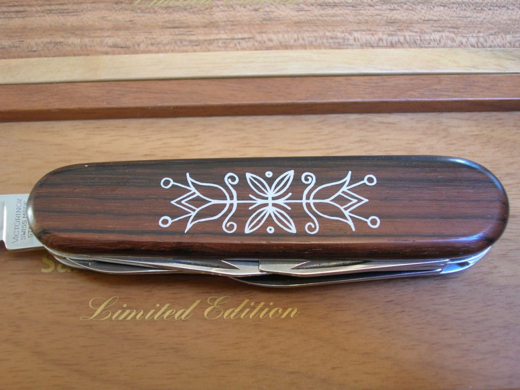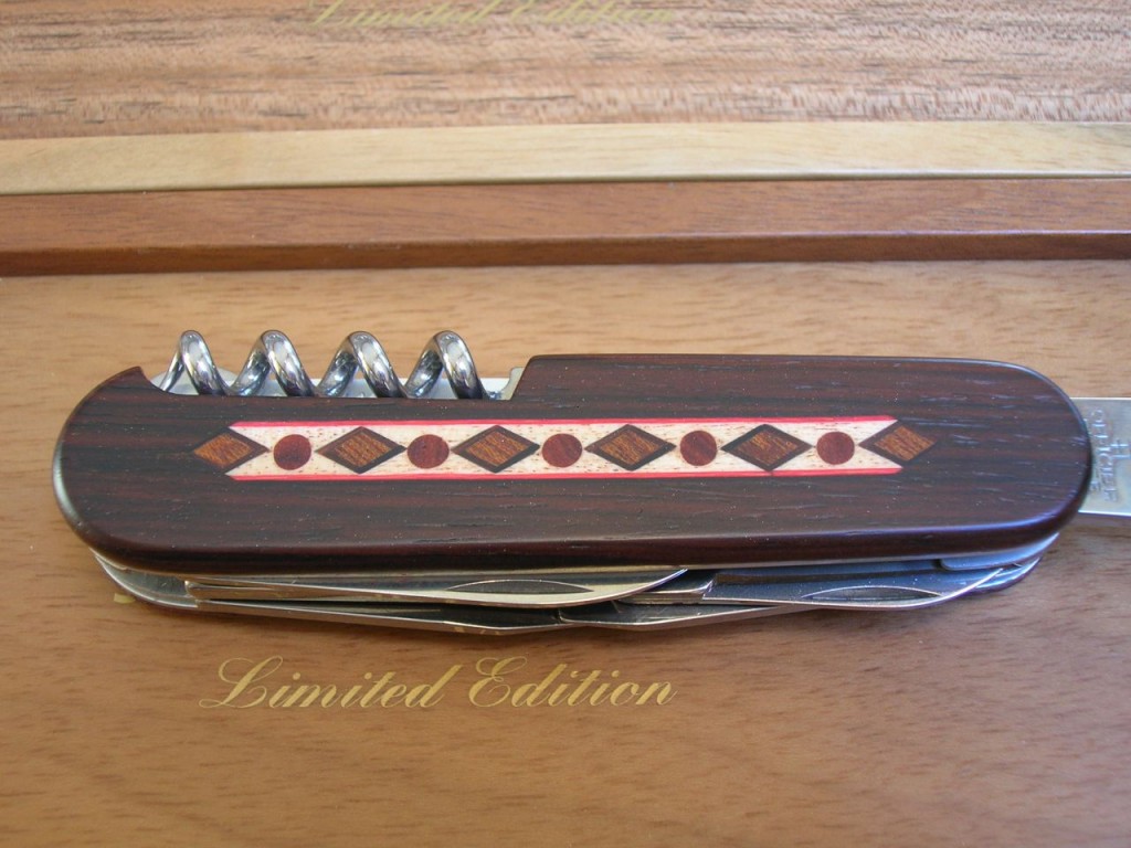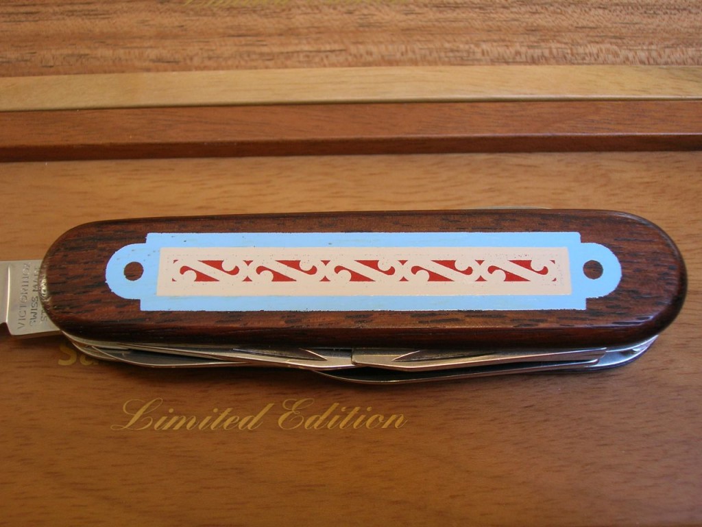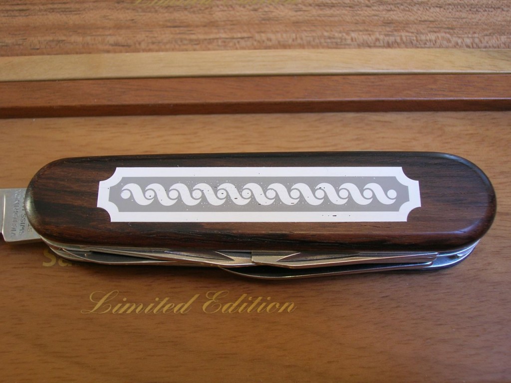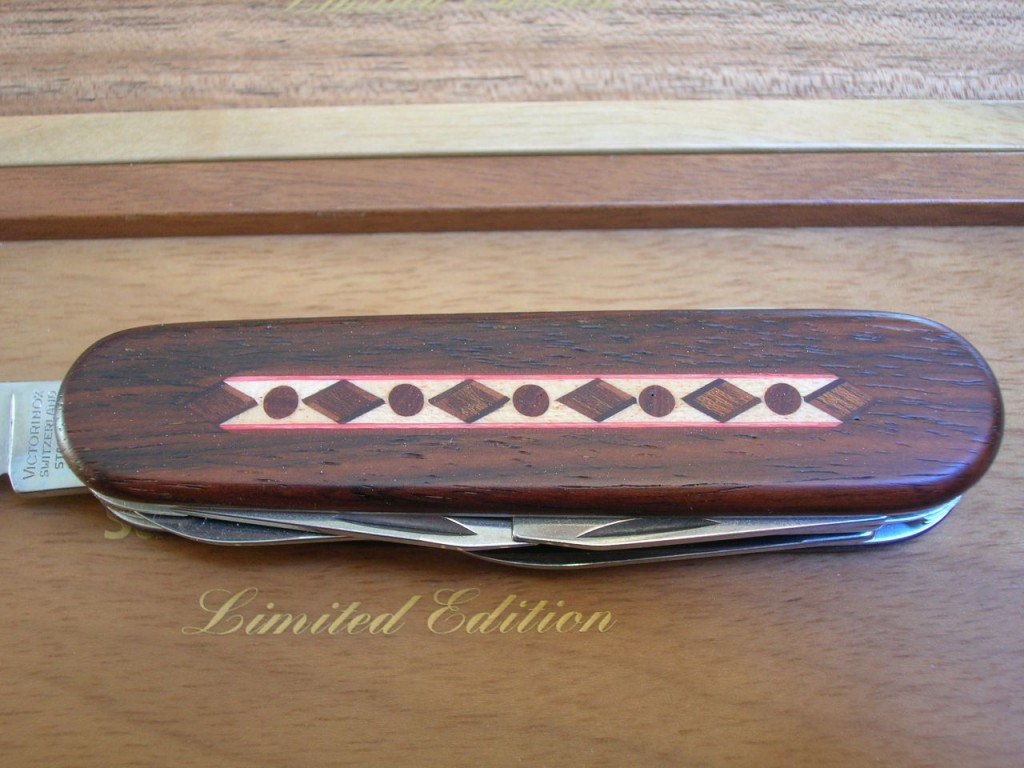 The rosewood front scale bears a stunning, delicate, coloured wood marquetry inlaid pattern. On some of the editions the reverse scales also carry the same marquetry. The Victorinox logo is printed on editions that do not have the reverse marquetry.