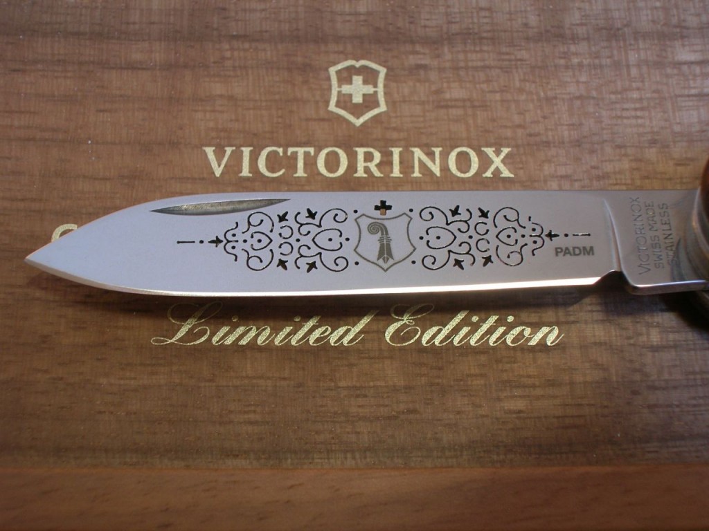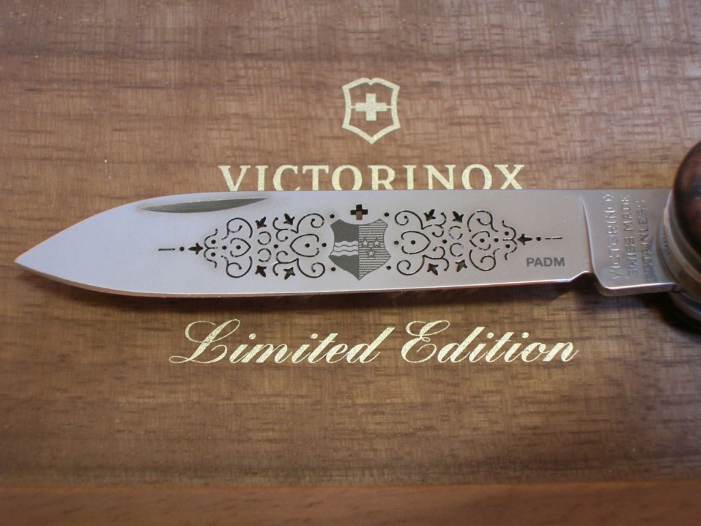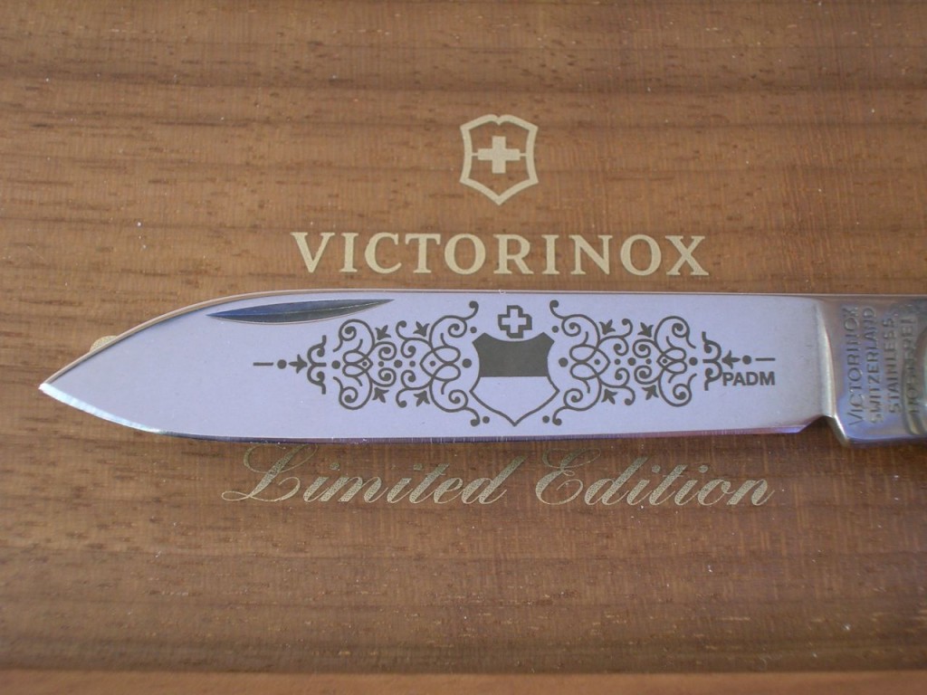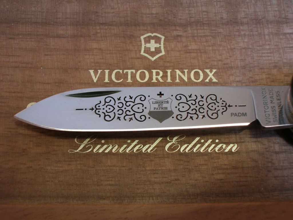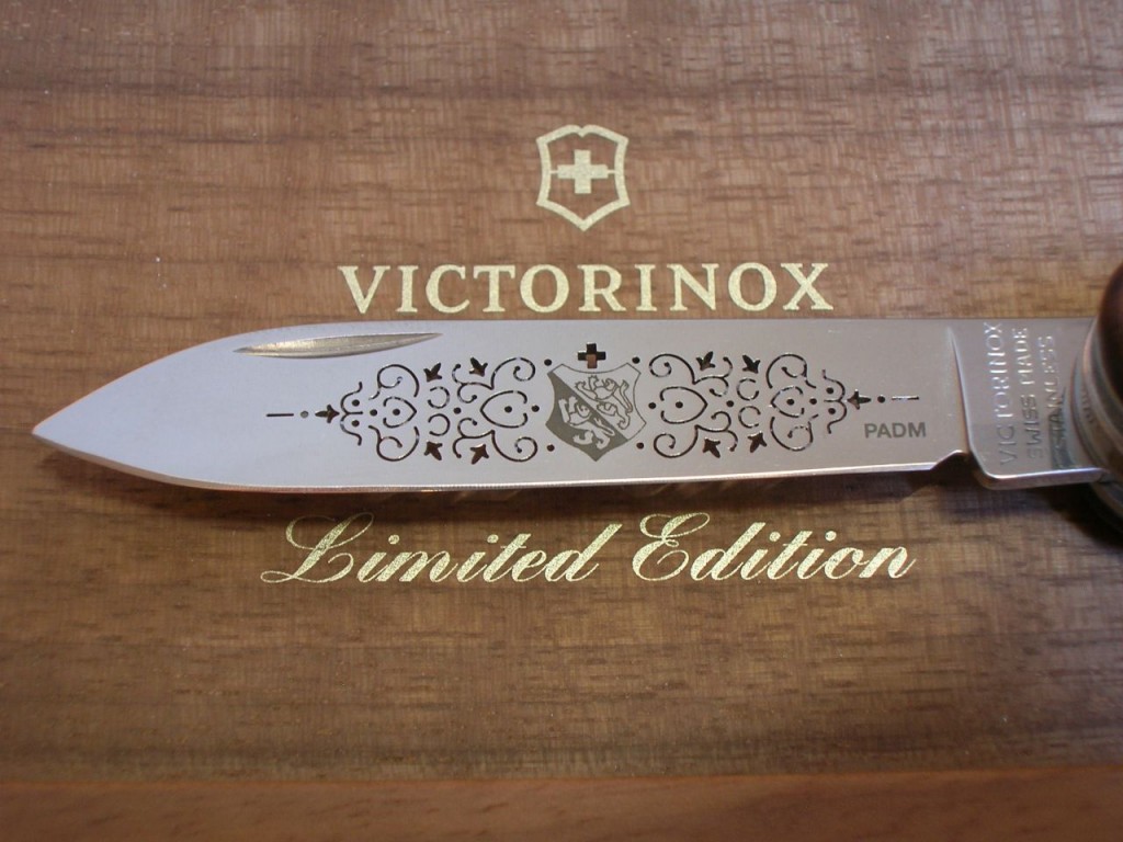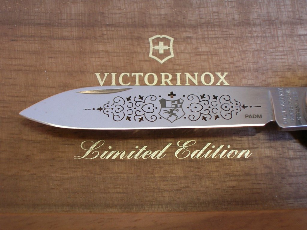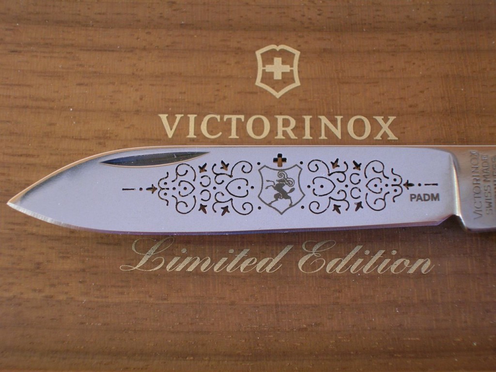The etched entwined pattern is replaced with a laser cut completely through the blade and therefore the pattern is also visible on blade’s reverse side. The canton’s coat of arms is still etched on the front of the blade and the Victorinox logo is etched on the reverse.