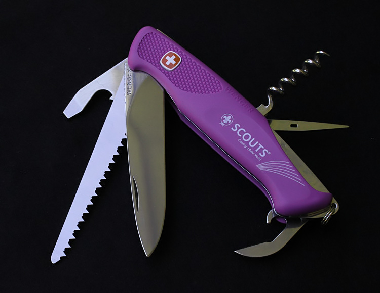 Original models had black nylon scales, contoured in the Evolution (Evo) style to fit the hand. Deep checkering is molded into the thumb area on both sides. One side carries the Wenger cross logo, with 'WENGER' molded into the scales. The cross logo icon is a push button, which, when depressed, releases the liner-lock on the knife blade. They are only available in black, except for the World Scout series which featured purple/violet scales.