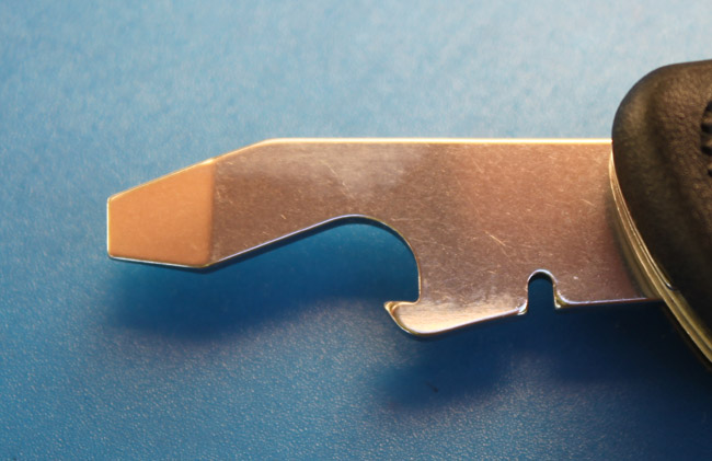 The front of the tool is blunt and flat, making a screwdriver for medium sized flat-head screws. The cap-lifter/bottle-opener is cut into the body of the tool, the small hook near the base is used to catch the lip of the cap, as the tool is moved upward. Just behind the cap-lifter is a small wire-stripping notch. See instructions below. Prior to 2011 (estimated ) the 84mm tool did not have a 'stop' when the tool was opened at the 90º angle. The 91mm version had this feature much earlier.