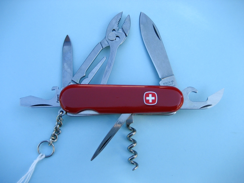 - 1.48.03: Plain-edged main blade; nail file (not small blade); corkscrew; long key chain; toothpick and tweezers